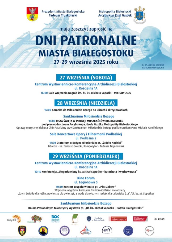 Zapraszamy do zapoznania się z programem oraz do udziału w obchodach Dni Patronalnych dedykowanych bł. ks. Michałowi Sopoćce – Patronowi Białegostoku. Obecny rok staje się szczególną okazją do wdzięcznej pamięci – w lutym minęło 50 lat od śmierci bł. ks. Michała Sopoćki, wiernego świadka Bożego miłosierdzia.